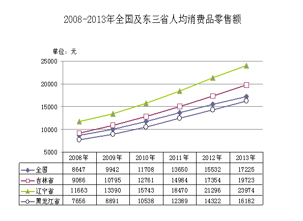 (二)人均消费品零售额略高于全国水平,在东北三省处于中游水平。截止到2013年底,我省社会消费品零售总额首次突破五千亿元,达到5426.4亿元,在全国排16位,人均消费品零售额19723元,高于全国平均水平2498元。与辽宁省和黑龙江省相比,我省处于中游水平,高于黑龙江省3541元,低于辽宁省4251元(见图2)。