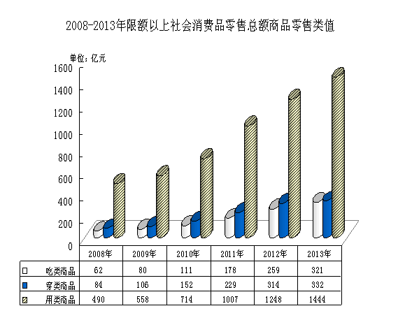 (三)吃、穿、用等生活必需品增速较快,消费结构升级助推了消费品市场快速发展。从2008—2013年限额以上企业消费品零售总额中看出,吃、穿、用类商品零售额保持快速增长势头,年均分别增长39.0%、31.6%和24.1%。在用类商品中,中西药品类年均增长50.9%,金银珠宝类年均增长45.3%,建筑及装潢材料类年均增长39.0%,家具类年均增长35.7%,化妆品类年均增长28.4%。尤其是近年来消费升级的加快,也助推了一些文化、旅游服务等商品零售的快速增长(见图3)。