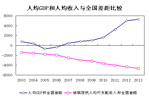 如果用人均GDP代表经济增长的水平,用城镇人均可支配收入代表城镇居民的收入水平,并与全国平均水平进行比较,列出2003年振兴之初,到2013年振兴十年后的对比示意图,能够明显看出一个剪刀差。