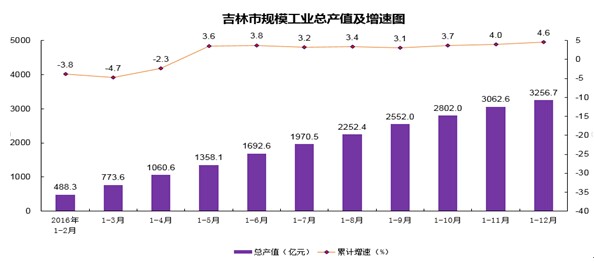 2016年以来,吉林市规模以上工业总产值呈现逐月回升的增长态势。2016年,吉林市规模工业完成产值3256.7亿元,同比增长4.6%,为年初以来的最高增速。自5月份以来,工业产值增速由负转正,一年来,工业产值总体呈现出逐月回升的态势。