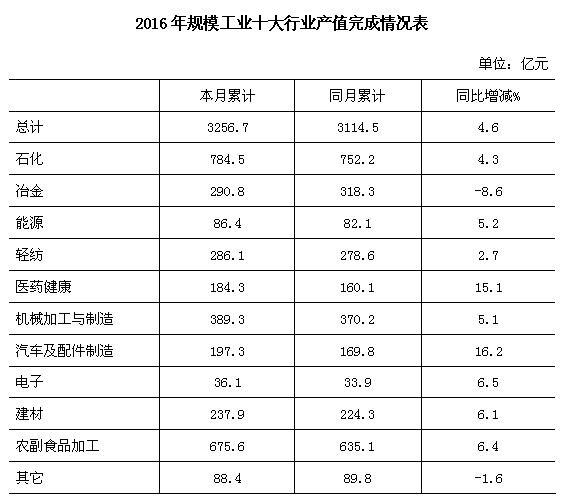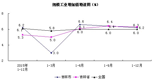 2016年年初以来,面对工业经济下行压力不断增大的复杂局面,吉林市工业战线在市委、市政府的正确领导下,积极应对困难,化解压力,工业经济稳中有进,结构向好。全年完成工业总产值3256.7亿元,同比增长4.6%;完成工业增加值755.2亿元,可比增长6.2%。主要呈现以下特点: