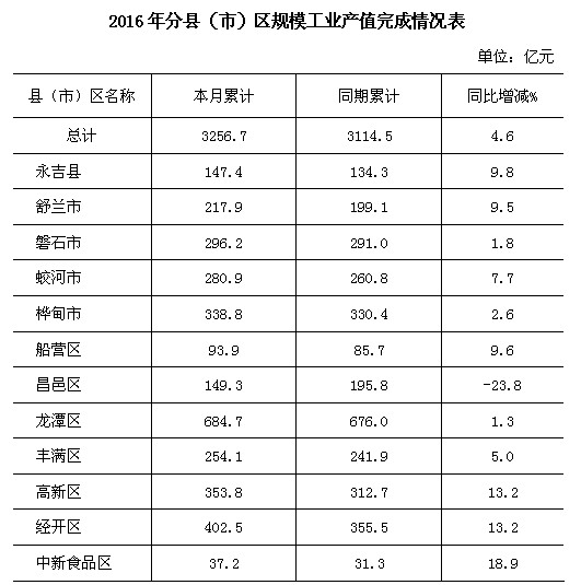 2016年,除昌邑区工业产值同比下降外,其余各县(市)区工业产值均为增长。其中:经开同比增长13.2%,高新同比增长13.2%,永吉同比增长9.8%,船营同比增长9.6%。