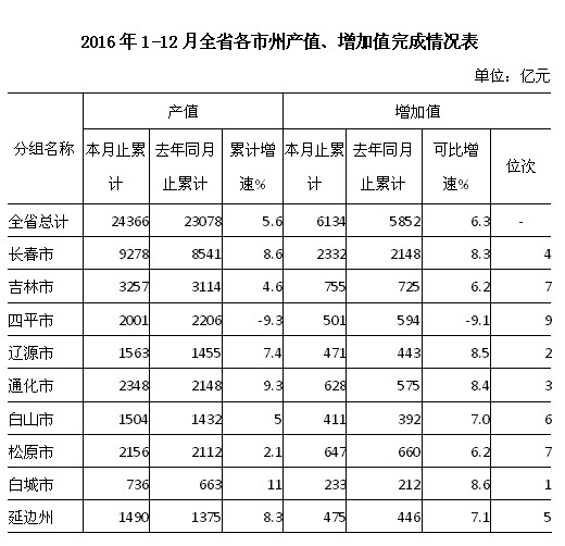 2016年,全省规模以上工业完成产值24366亿元,同比增长5.6%;完成增加值6134亿元,可比增长6.3%。吉林市工业产值占全省工业总产值的13.4%,增加值占全省工业增加值的12.3%,工业增速位居全省第7位,高于四平市,与松原持平。