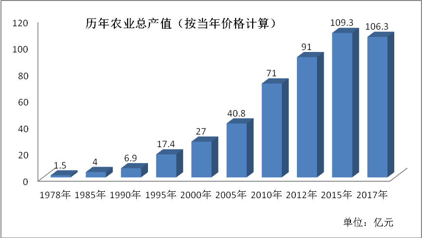进入新世纪,国家连续十五年发布的中央一号文件都是“三农”问题。“十八大”以来,党中央加大对农业、农村投入,极大地调动了农民的生产积极性,促进了农村经济的快速发展。1978年白山市农业总产值仅有1.5亿元,经过40年的发展白山市农业总量由改革初期的1.5亿元增加到2017年末的106.3亿元,累计增长69.8倍,年均(现价)增长11.5%。
